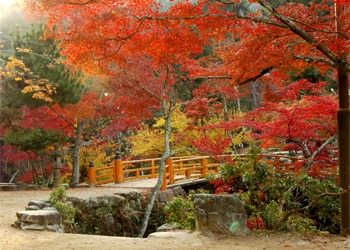 廿日市観光のハイライトである宮島は、秋になるとさらに美しさが増します。厳島神社を彩る紅葉は、廿日市の秋を象徴する景色です。中でも、紅葉の名所として知られるのが、厳島神社の背後に広がる「紅葉谷公園」。例年11月中旬から下旬にかけて、約700本のモミジが園内を鮮やかな朱色に染め上げます。