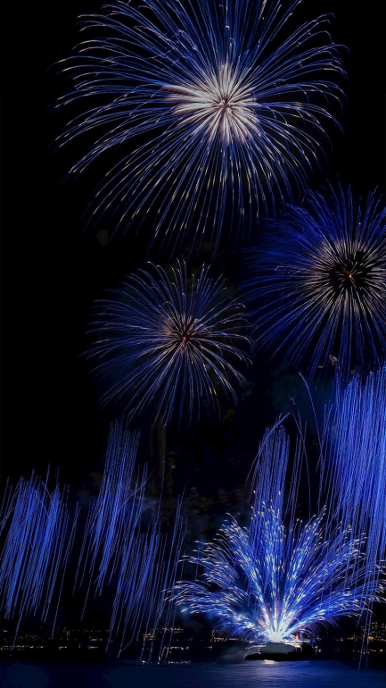 どこから見ても絵になる、とはまさにこのこと。大鳥居のシルエットを背景に、花火が連続して夜空を染めていく。水面に映る火の粉までもが美しく、まるで海そのものが光を放っているようでした。
